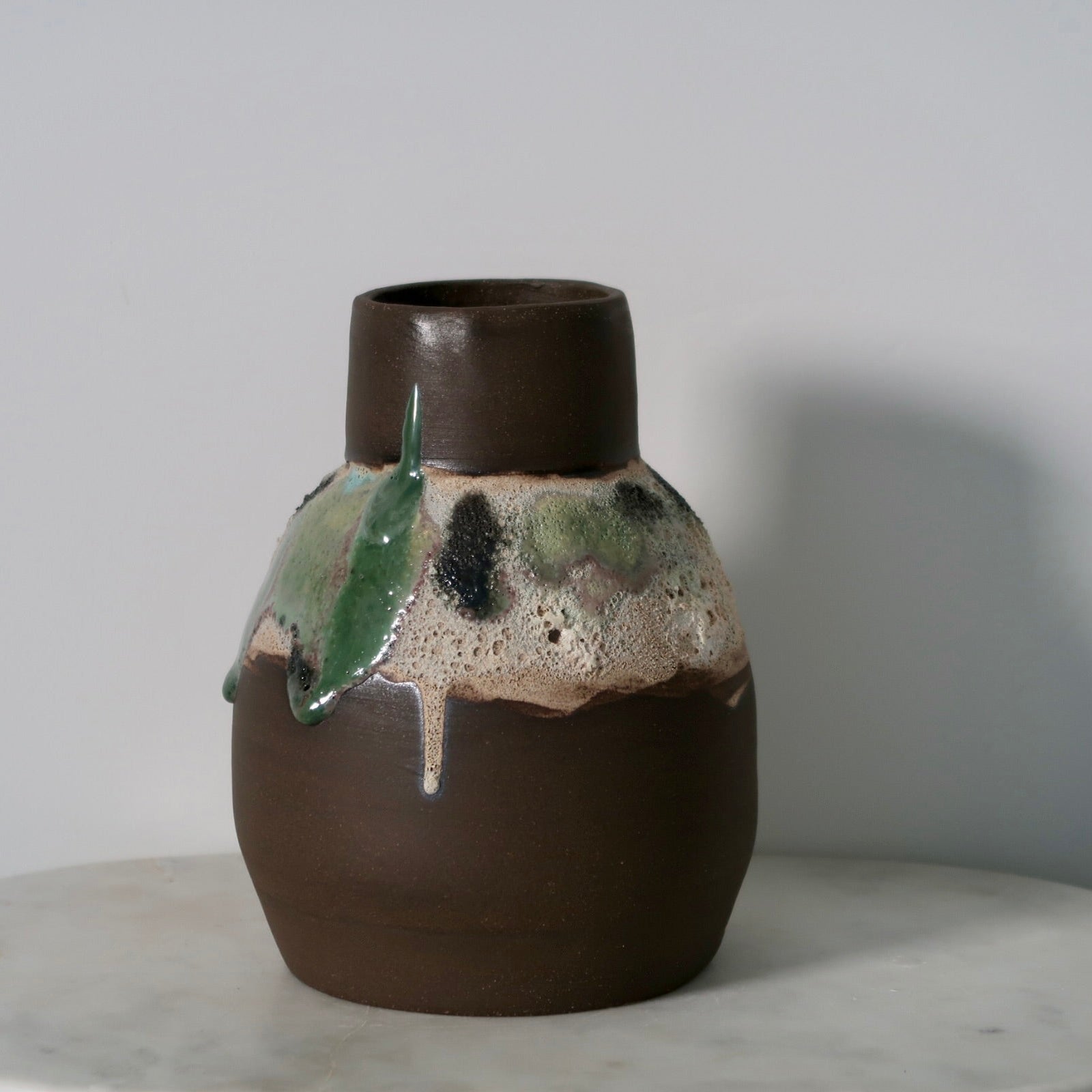 Hand-thrown black stoneware ceramic vase. This piece has gone through the creative process of being hand thrown, hand-sculpted, fired in a kiln, layered with many different glazes to create it's unique texture variations, and fired one last time.